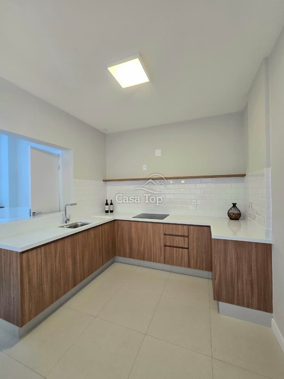 * Cozinha planejada com bancada, cooktop a indução já instalado, e infraestrutura para máquina de lavar louça.