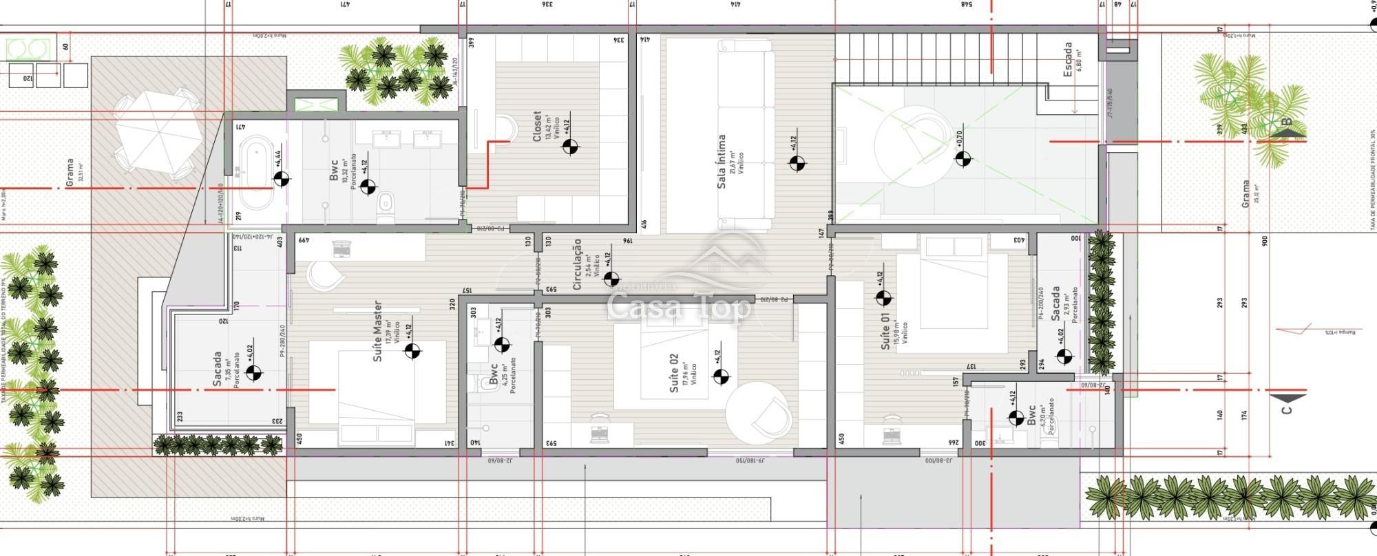 Piso Superior: 3 suítes (sendo 1 master com sacada e closet) e sala para íntima;
